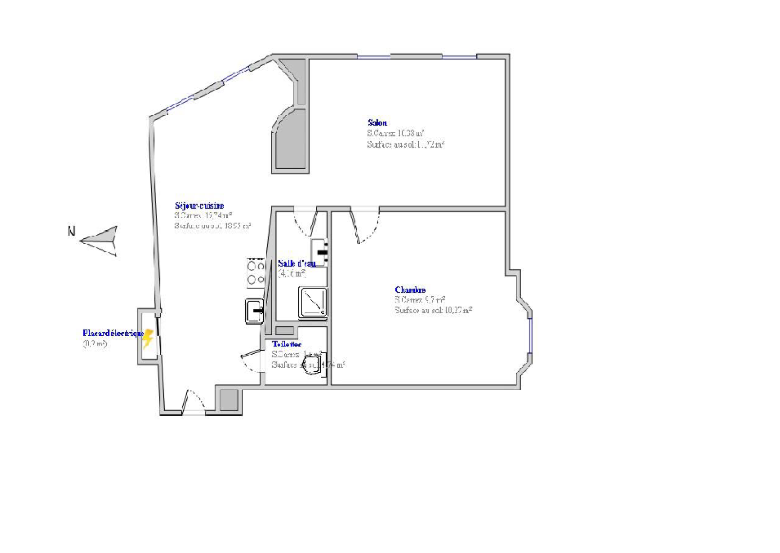 Il se compose d'une pièce de vie avec cuisine et salle à manger, un salon, une salle d'eau et une chambre, WC indépendant.