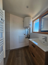 A l’étage : un bureau mansardé, une salle d’eau et un WC.