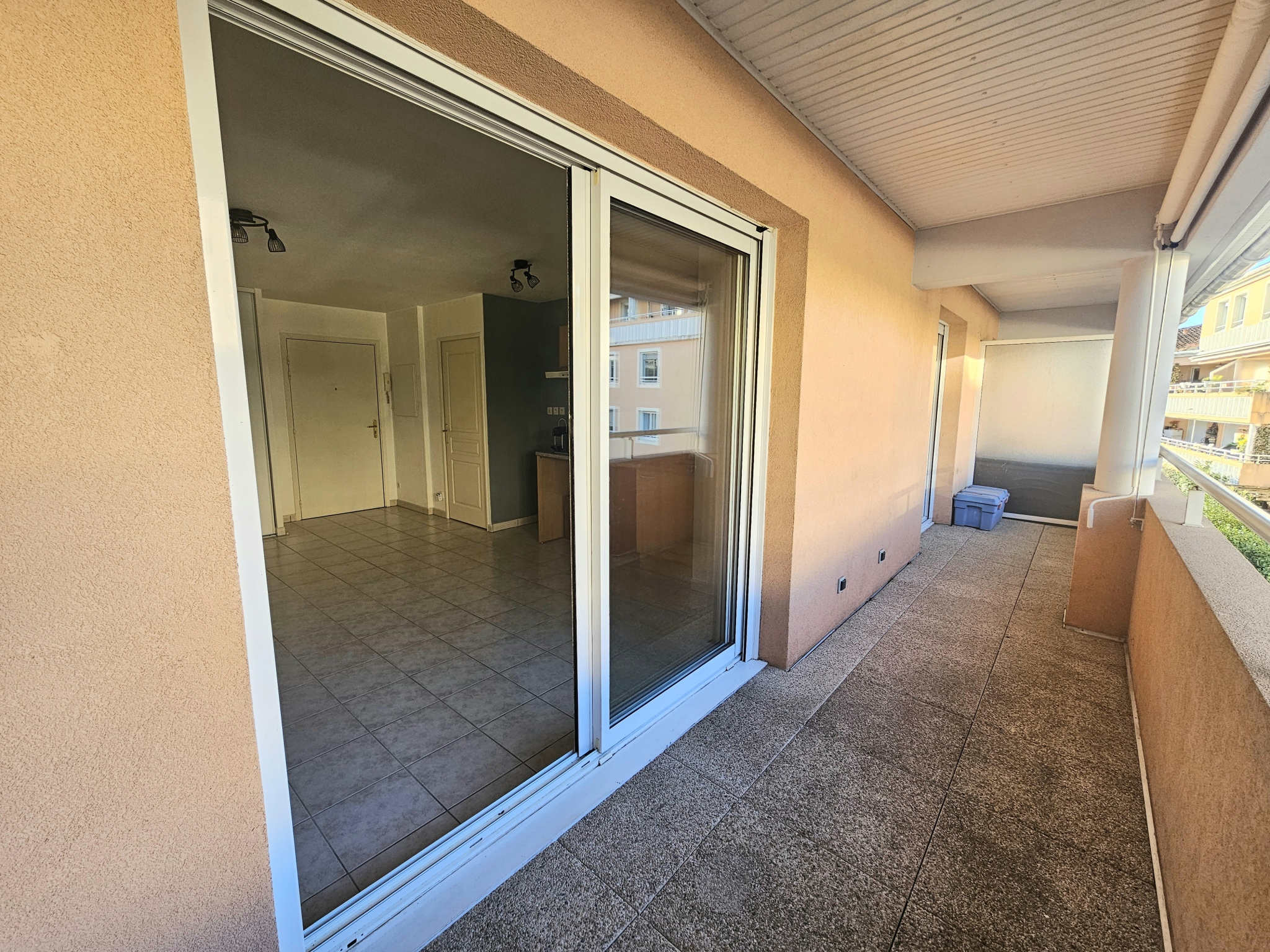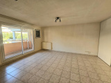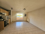 Un salon avec cuisine et placard donnant sur une belle terrasse, un dégagement, une chambre avec placard, une salle de bains, un WC indépendant