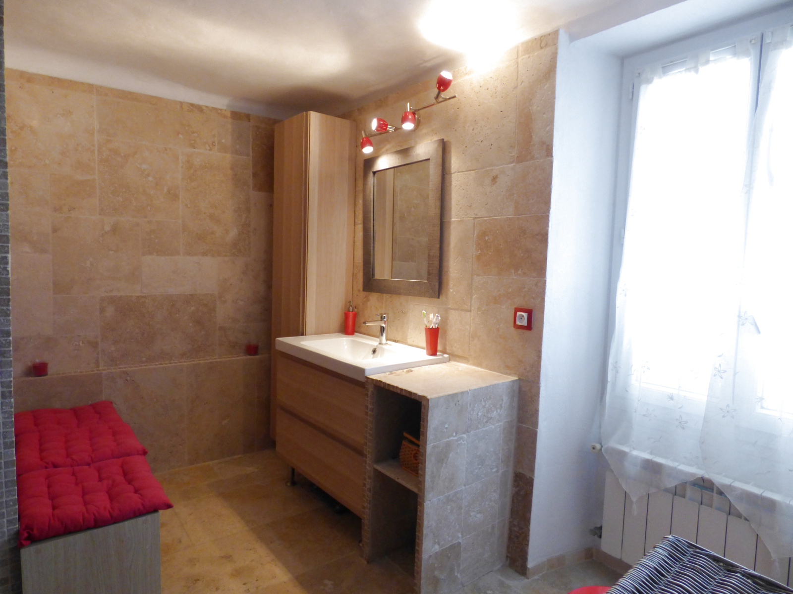 Elle se compose au rez de chaussée, d'une cuisine ouverte sur la pièce de vie, un WC indépendant.