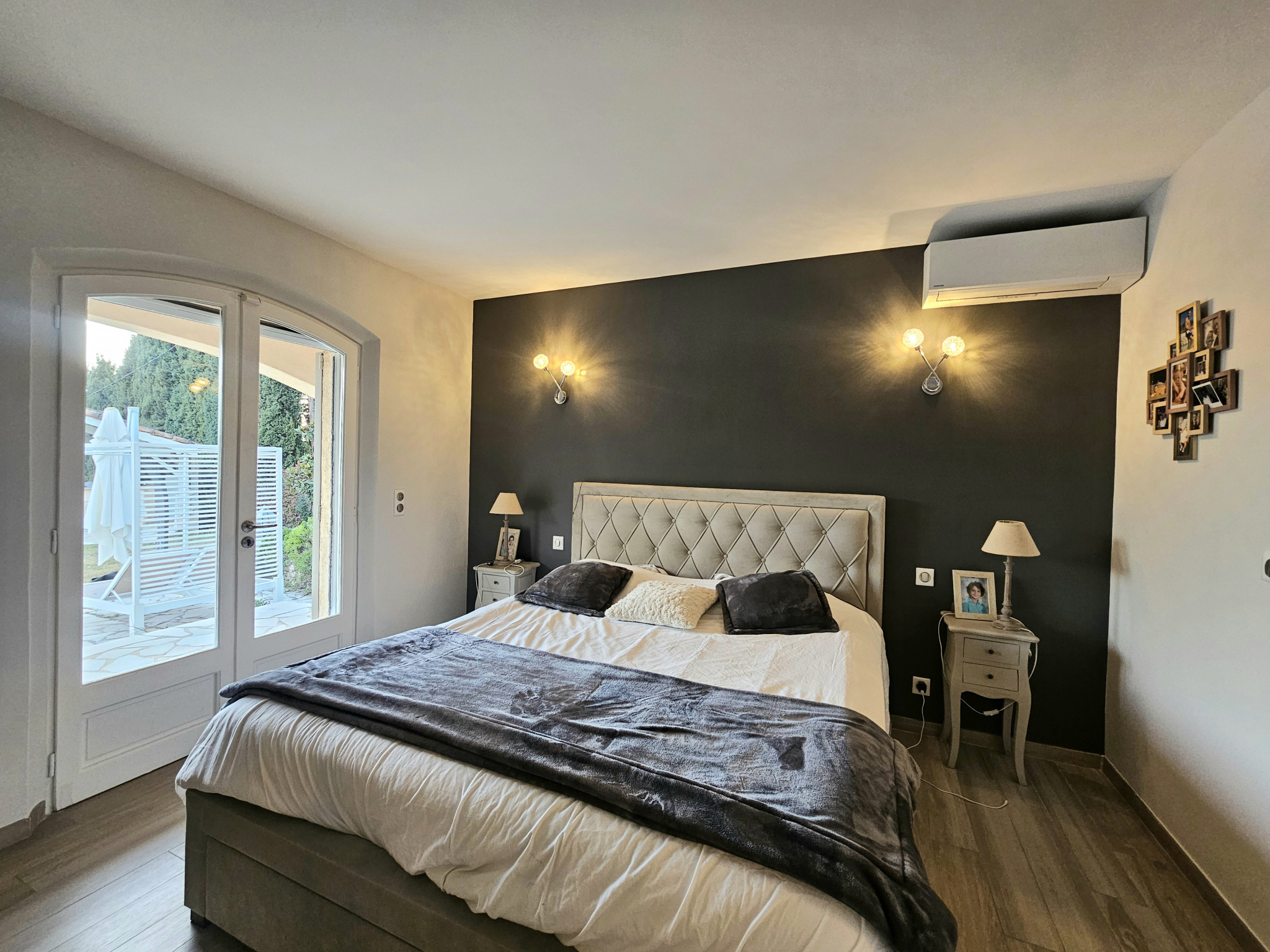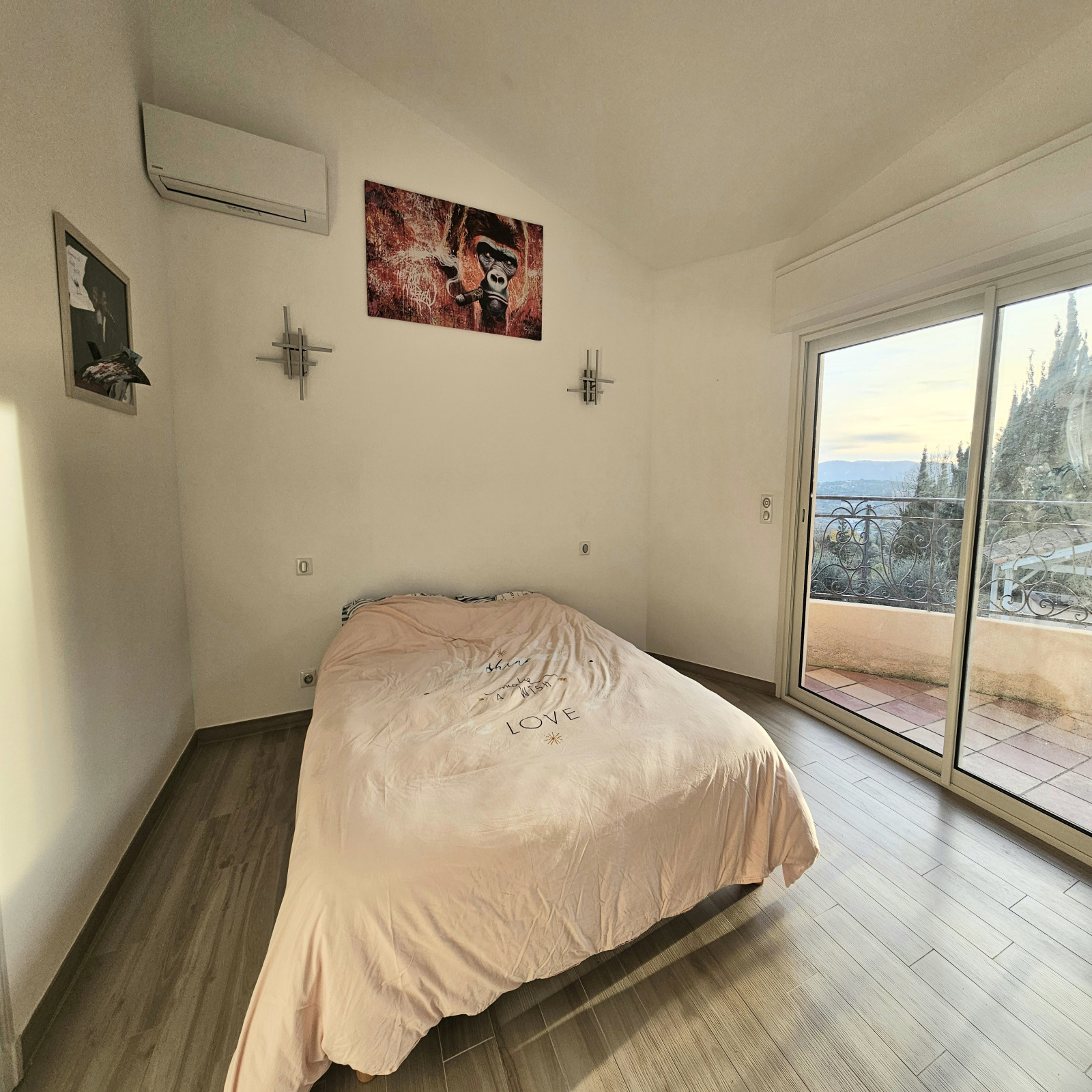 Mezzanine : une chambre parentale avec salle de bains et WC donnant sur une terrasse solarium