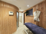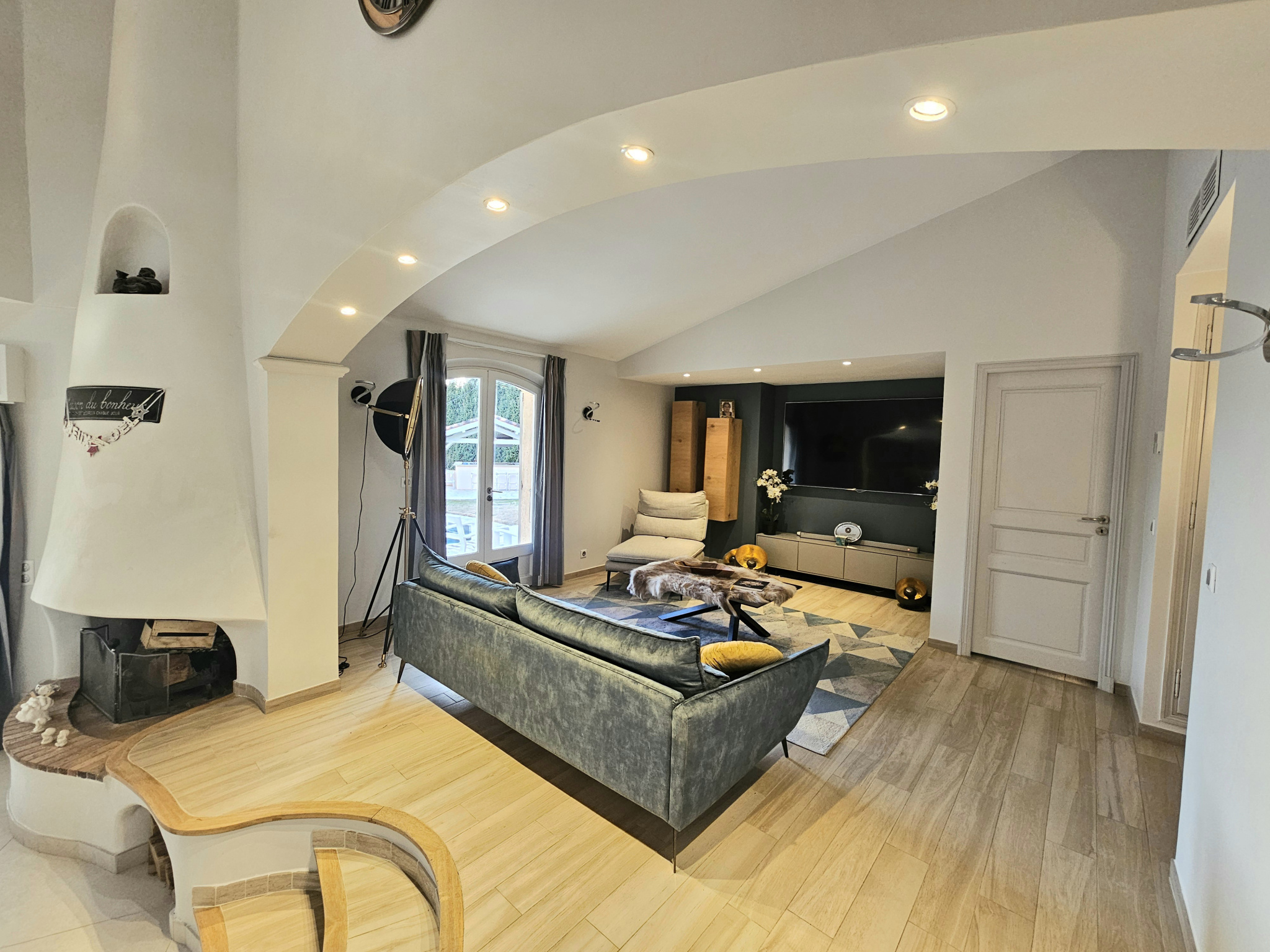 En rez-de-jardin : un spatieux salon / salle à manger avec cheminée donnant sur une velle terrasse, une cuisine indépendante équipée + une arrière cuisine / buanderie, un bureau, un WC indépendant, une chambre de maître avec dressing et salle de bains avec douche, baignoire balnéo et WC, un sauna, un WC indépendant