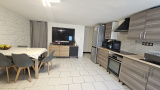 En rez de rue : sejour avec cuisine ouverte et dégagement.